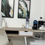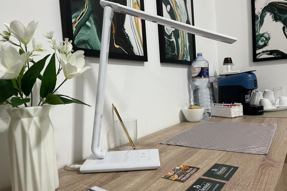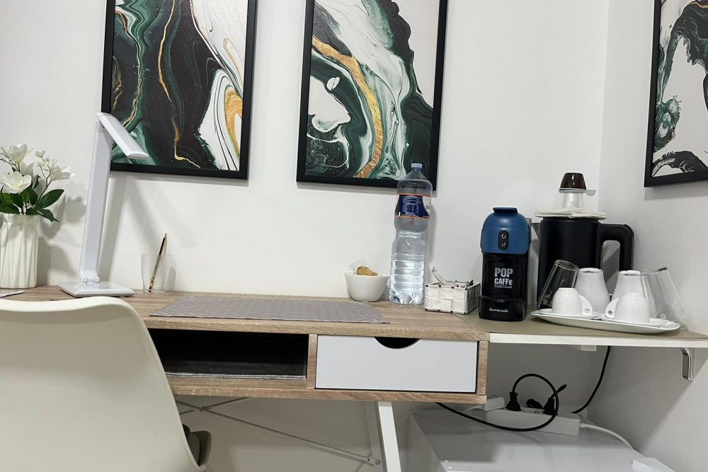 di scrivania con 1 sedia, TV full HD , piccolo congelatore e frigo bar, bollitore elettrico, armadio, specchiera, macchinetta con cialde per il caffè espresso, wifi, presa Usb , set di cortesia, phon, teli bagno, biancheria camera, climatizzatore inverter.